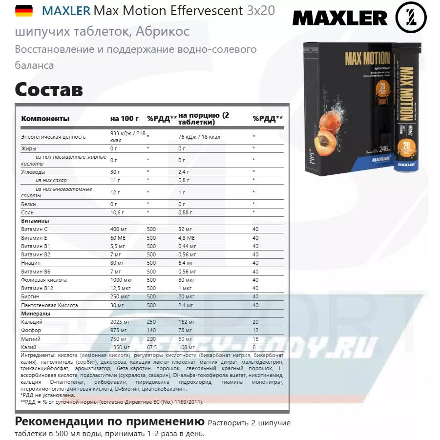 MAXLER Max Motion Effervescent 3х20 шипучих таблеток, Абрикос — Восстановление и поддержание водно-солевого баланса