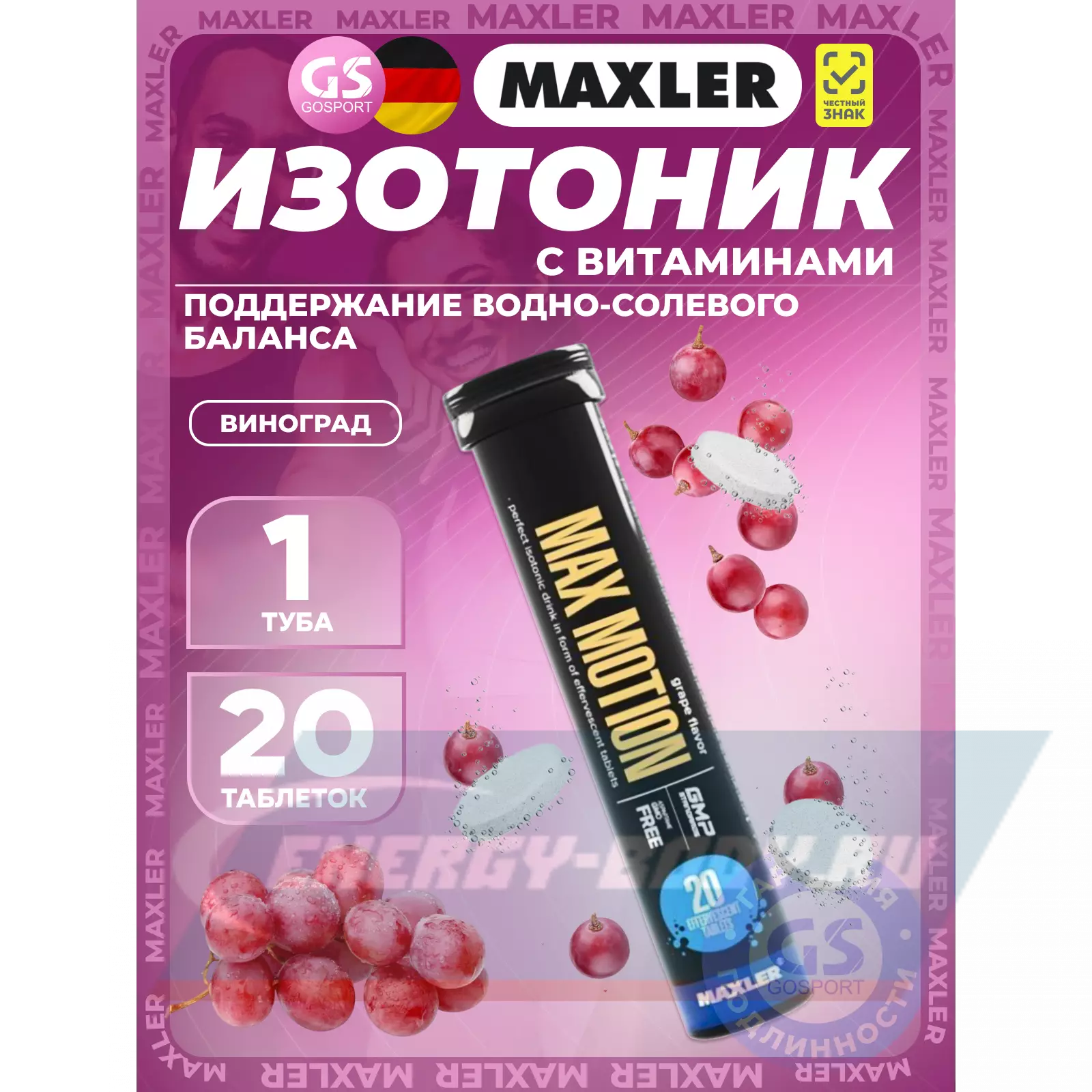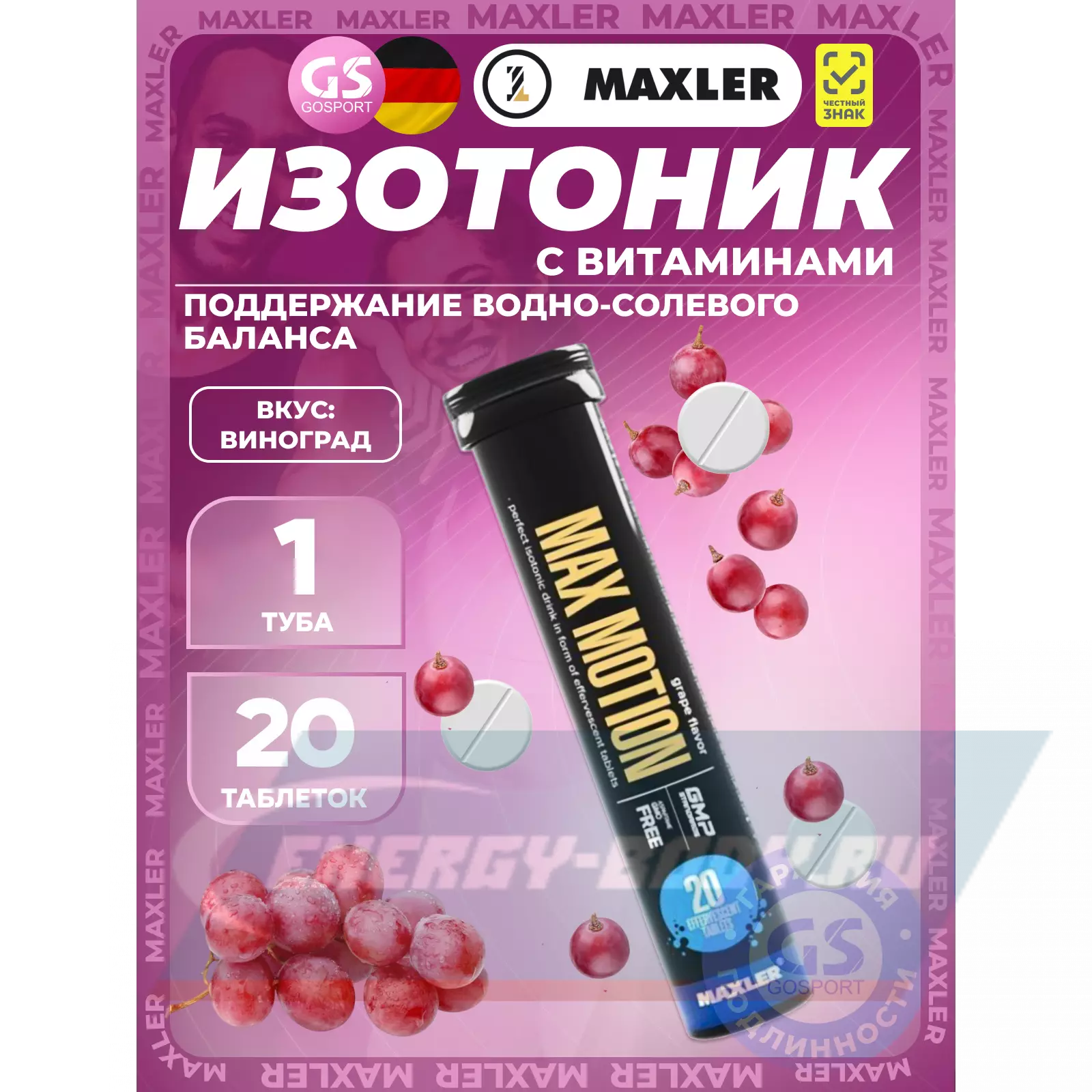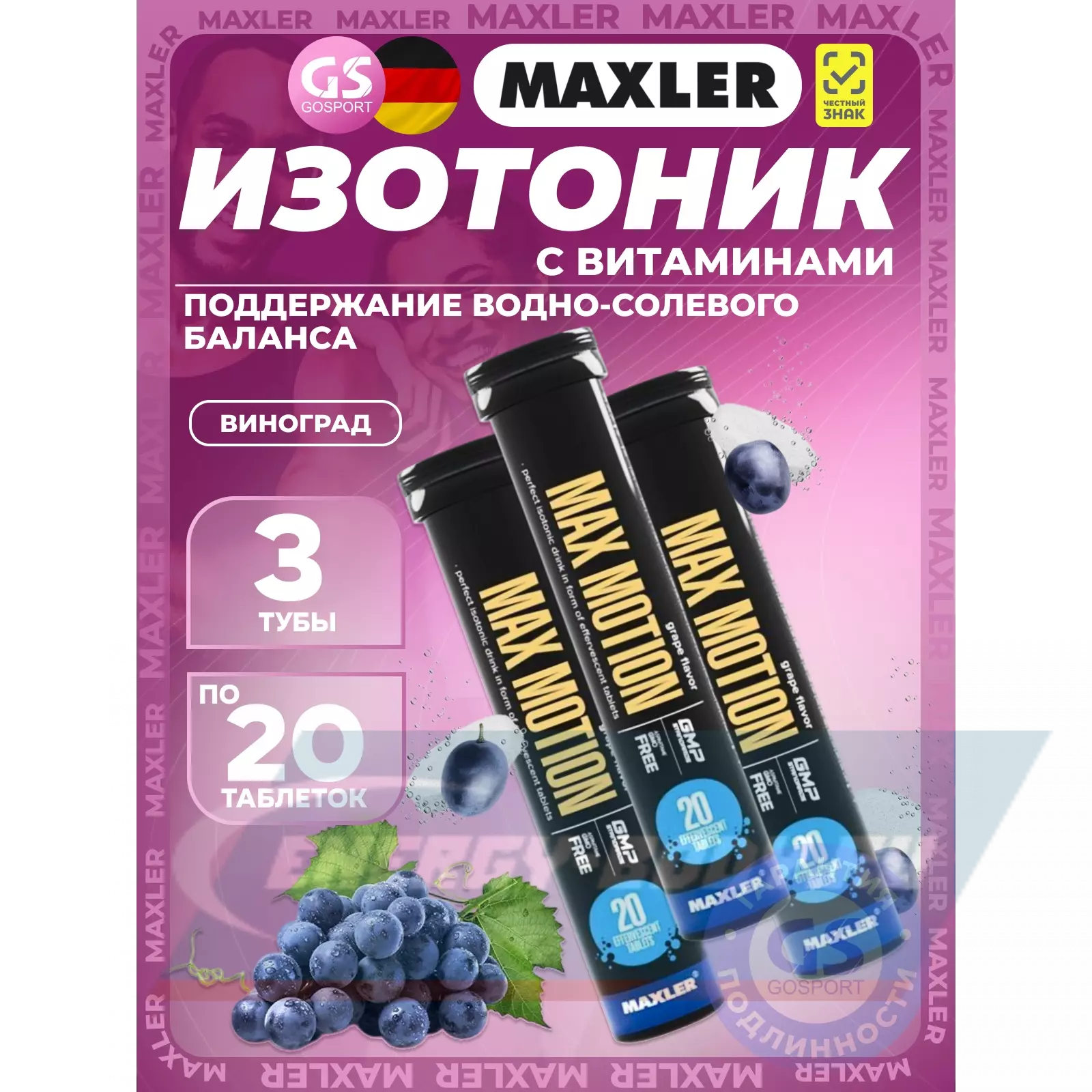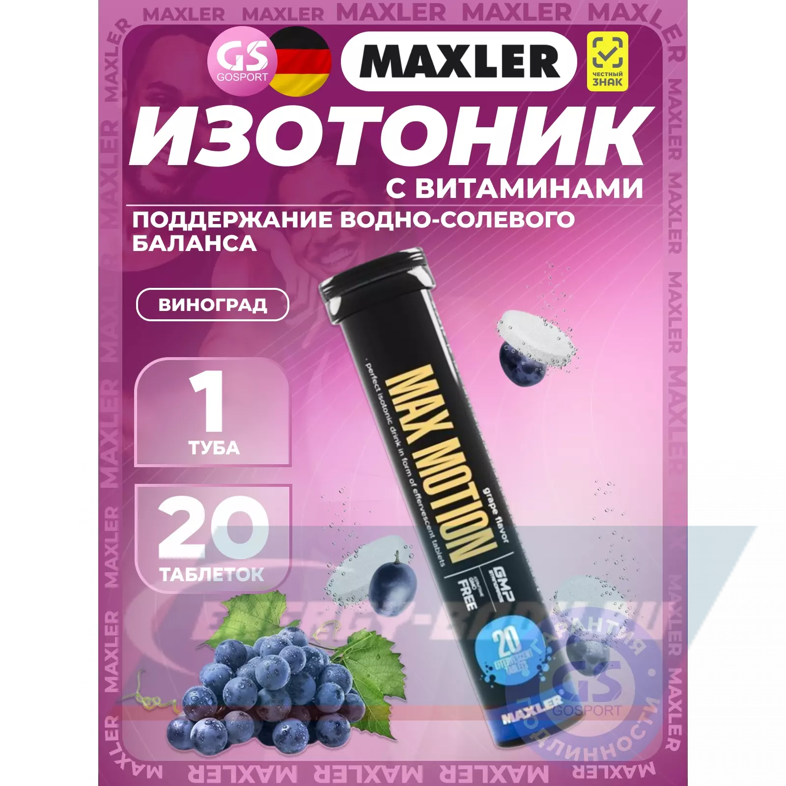 MAXLER Max Motion Effervescent 3х20 шипучих таблеток, Виноград — Восстановление и поддержание водно-солевого баланса