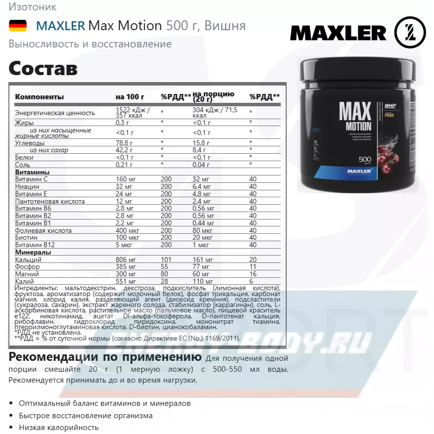 Max Motion – витаминно-минеральный комплекс для приготовления изотонического напитка. Комплекс предназначен для восполнения в организме витаминов и минералов, утраченных в результате физических нагрузок. Продукт создан для людей, занимающихся игровыми, силовыми видами спорта, фитнесом либо просто ведущих активный образ жизни.