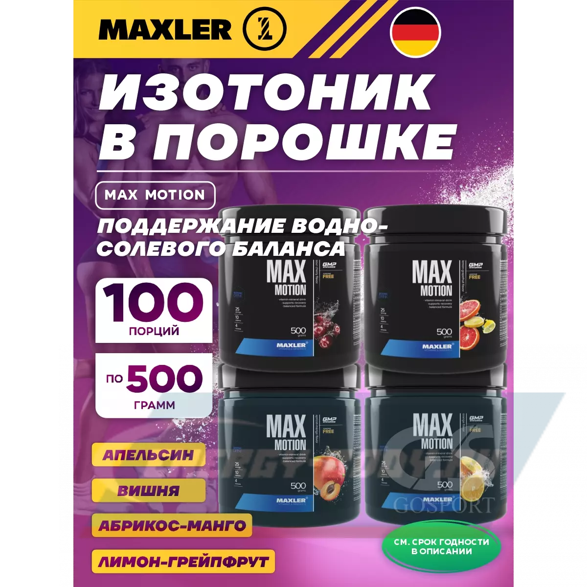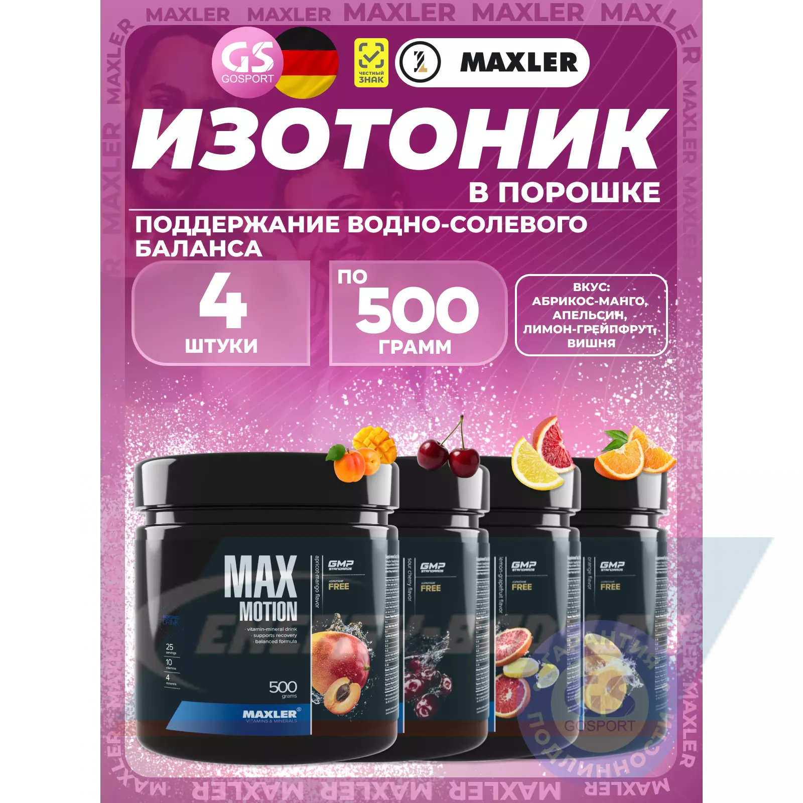 MAXLER Max Motion 4 х 500 г, Абрикос-манго, Апельсин, Лимон-грейпфрут, Вишня — Восполнение витаминов и минералов