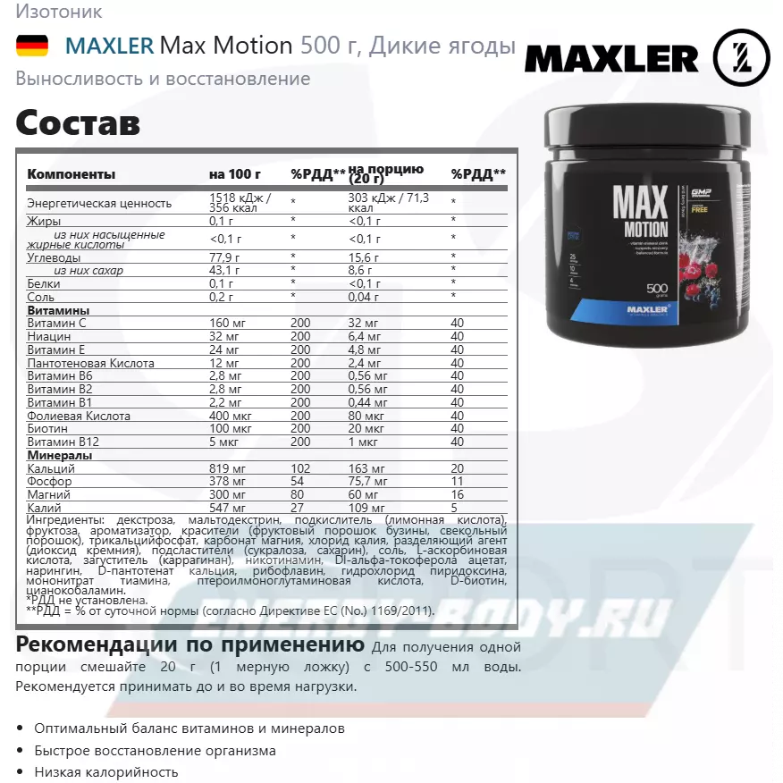 Max Motion – витаминно-минеральный комплекс для приготовления изотонического напитка. Комплекс предназначен для восполнения в организме витаминов и минералов, утраченных в результате физических нагрузок. Продукт создан для людей, занимающихся игровыми, силовыми видами спорта, фитнесом либо просто ведущих активный образ жизни.
