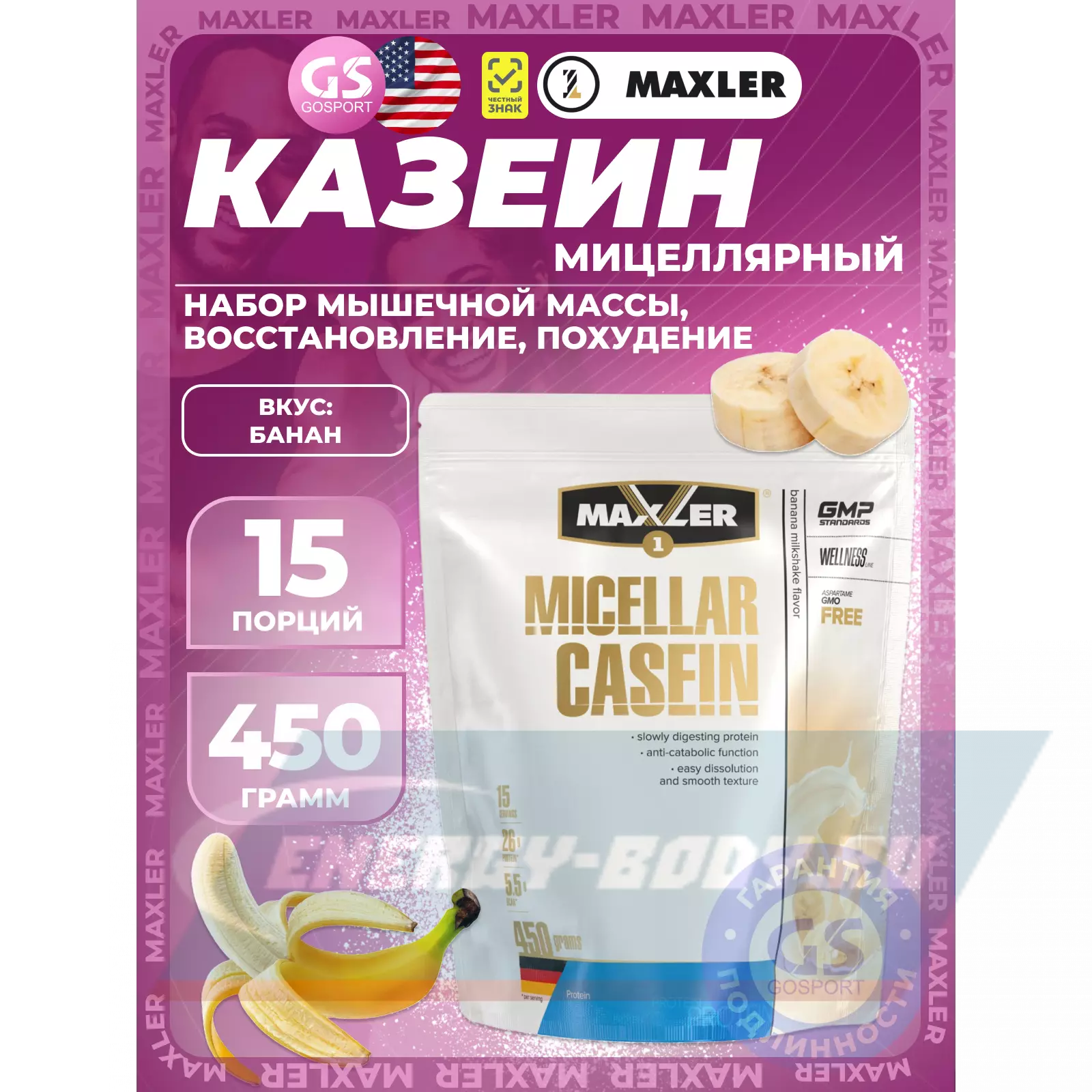 MAXLER Micellar Casein 450 г, Банан — Стимуляция синтеза белка, Длительное насыщение
