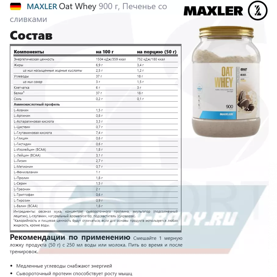 Ингредиенты: овсяная мука, концентрат сывороточного протеина, эмульгатор (подсолнечный лецитин), L-глутамин, натуральный ароматизатор, подсластитель (сукралоза).