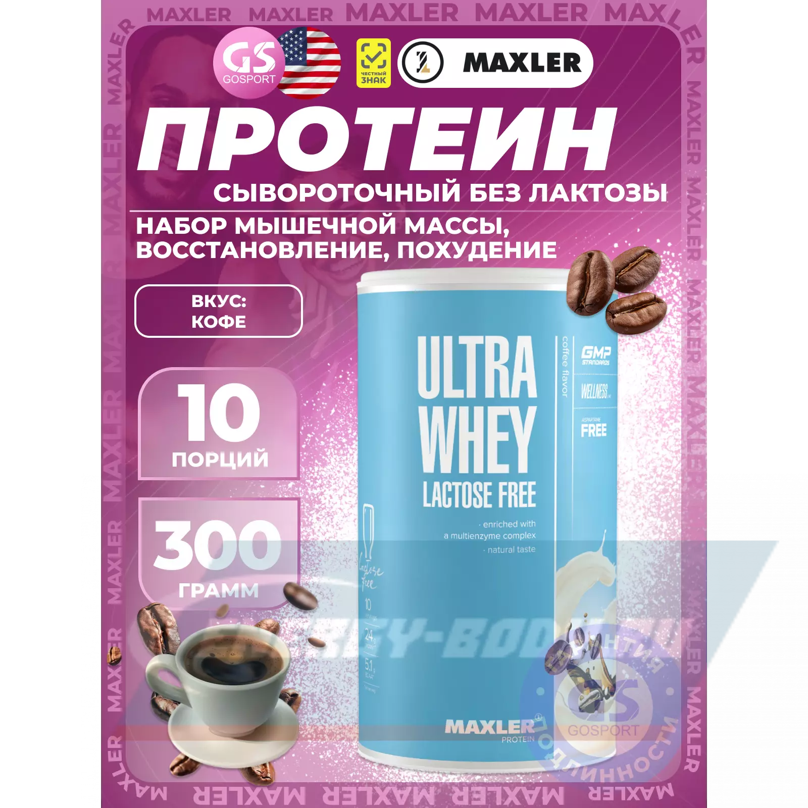 MAXLER Ultra Whey Lactose Free 300 г, Кофе — Отсутствие лактозы, Минимальное количество жиров и сахаров