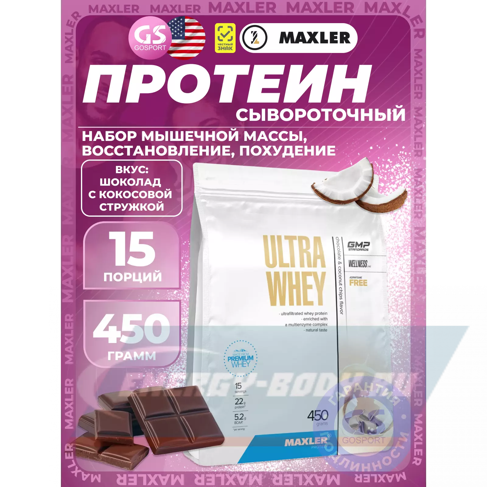 MAXLER Ultra Whey 450 г, Шоколад с кокосовой стружкой — Для роста и восстановления мышц