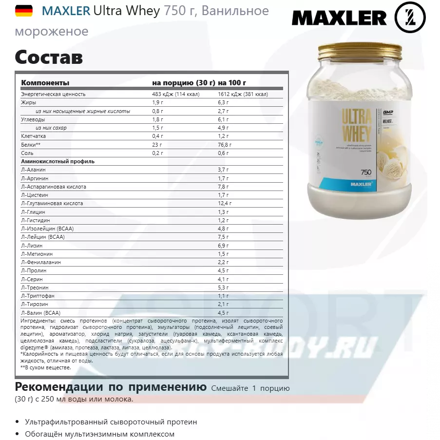 После тяжёлых физических нагрузок мышцы нуждаются в восстановлении и поддержке. Для достижения данной цели необходим белок, поскольку он выполняет функцию основных строительных блоков человеческого организма. Протеин способствует увеличению роста мышц и улучшению восстановления мышечной ткани после интенсивных тренировок. Ultra Whey – это 80%-ый сывороточный протеин высочайшего качества, который произведён из лучшего молока коров на свободном выпасе.