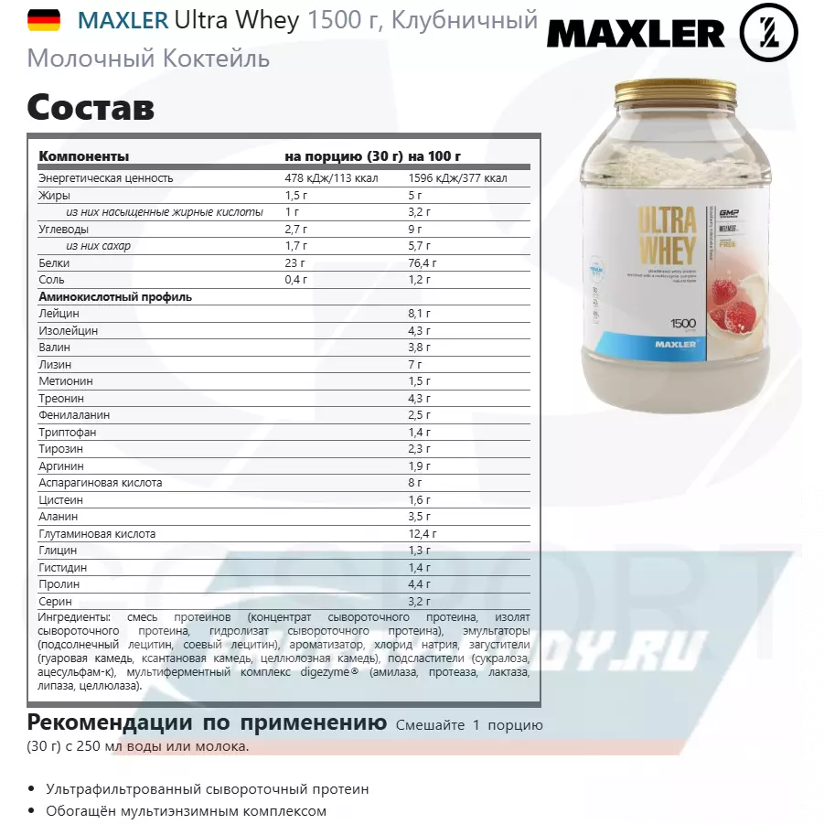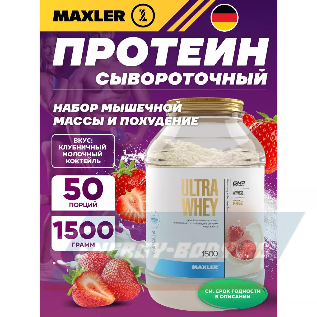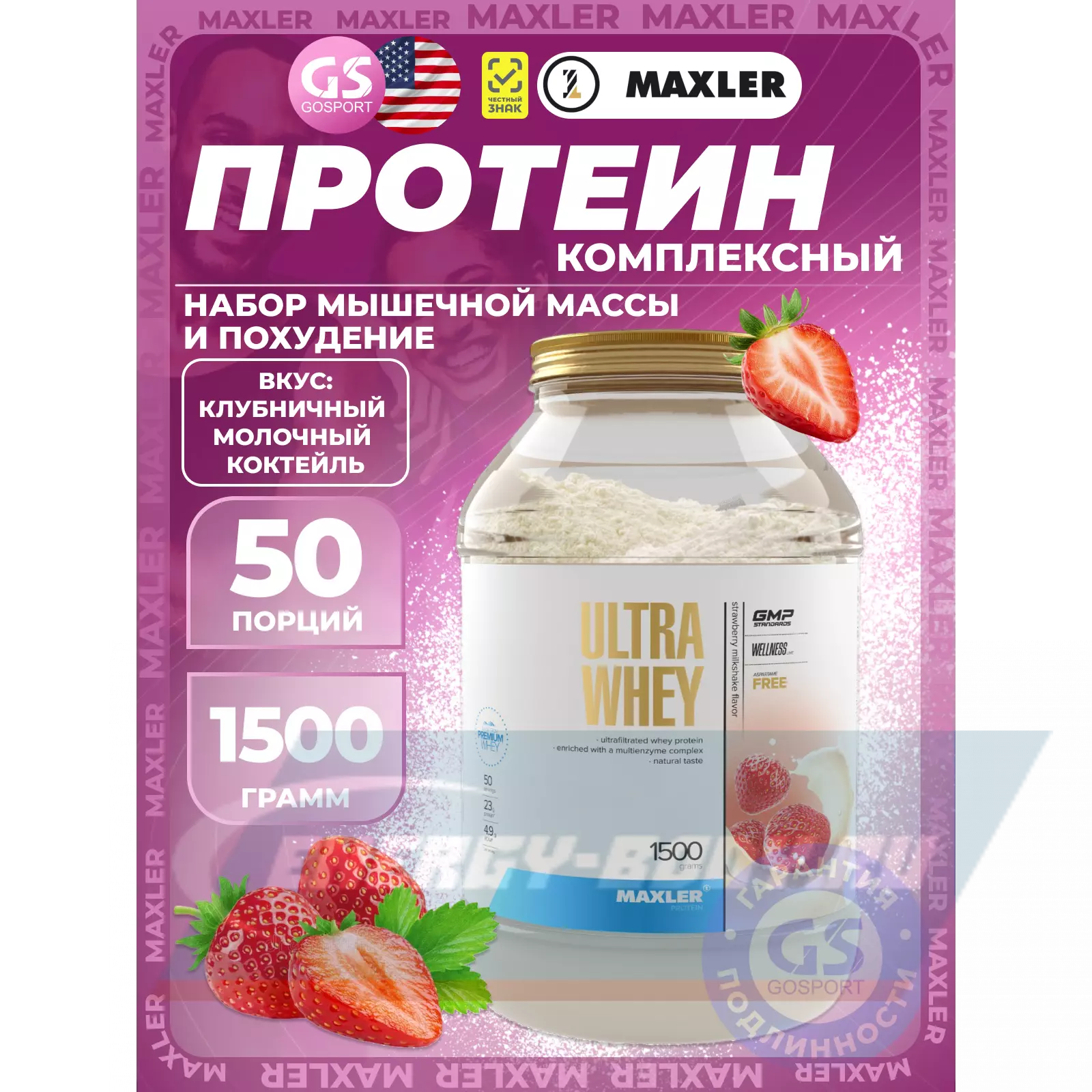 MAXLER Ultra Whey 1500 г, Клубничный Молочный Коктейль — Для роста и восстановления мышц