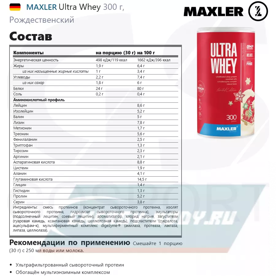 Продукт отличается крайне низким содержанием жира и углеводов. Ultra Whey отлично смешивается, легко усваивается благодаря мультиэнзимному комплексу DigeZyme® и обладает удивительным натуральным вкусом. Ultra Whey замечательно подойдёт как для спортсменов и бодибилдеров, так и для активных людей, нуждающихся в натуральном белке высокого качества.