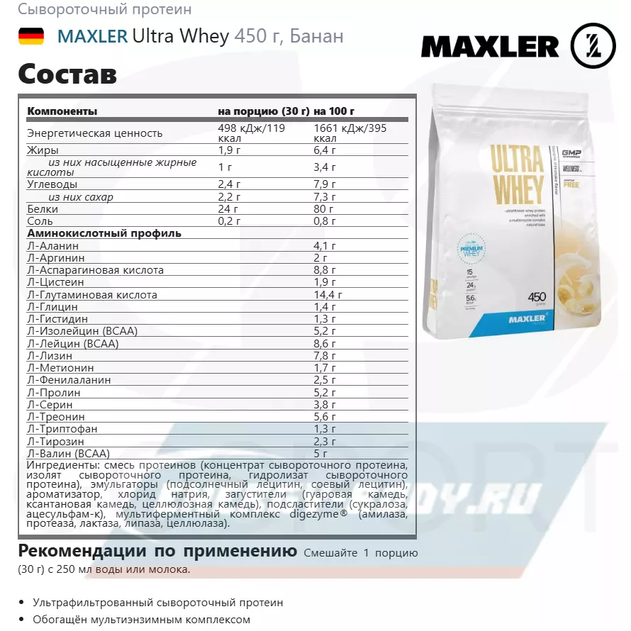 Продукт отличается крайне низким содержанием жира и углеводов. Ultra Whey отлично смешивается, легко усваивается благодаря мультиэнзимному комплексу DigeZyme® и обладает удивительным натуральным вкусом. Ultra Whey замечательно подойдёт как для спортсменов и бодибилдеров, так и для активных людей, нуждающихся в натуральном белке высокого качества.