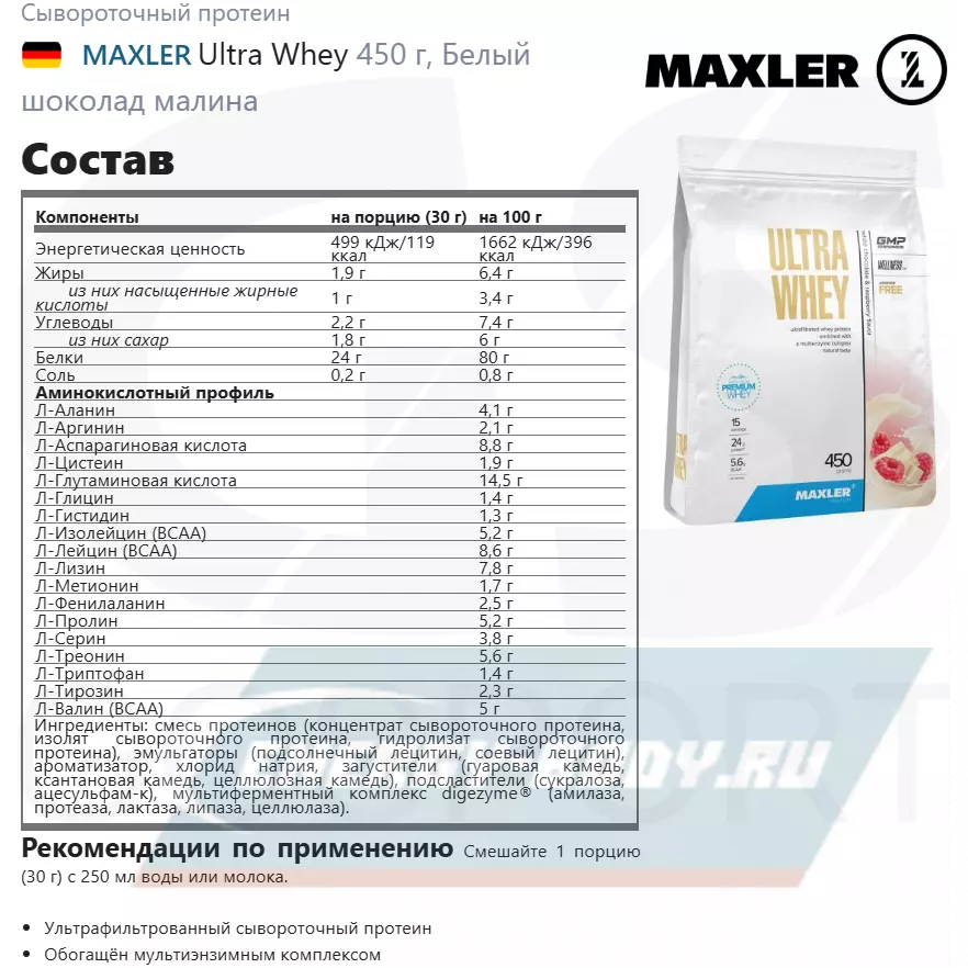 MAXLER Ultra Whey 450 г, Белый шоколад малина — Для роста и восстановления мышц