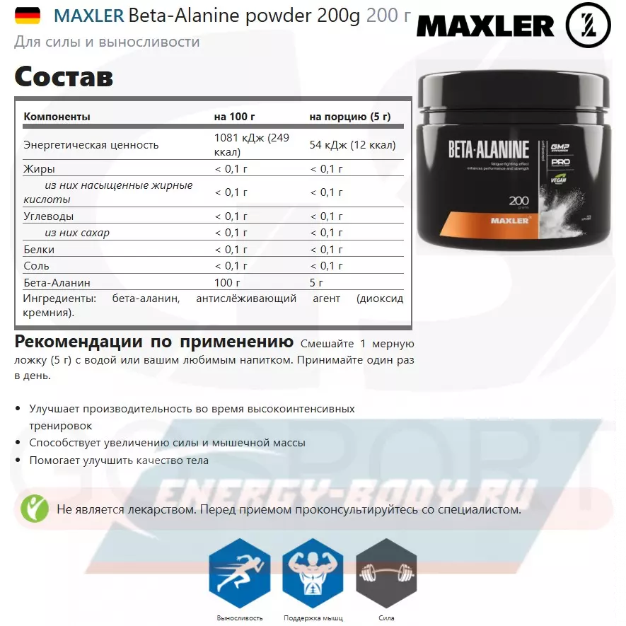 Ингредиенты: бета-аланин, антислёживающий агент (диоксид кремния).