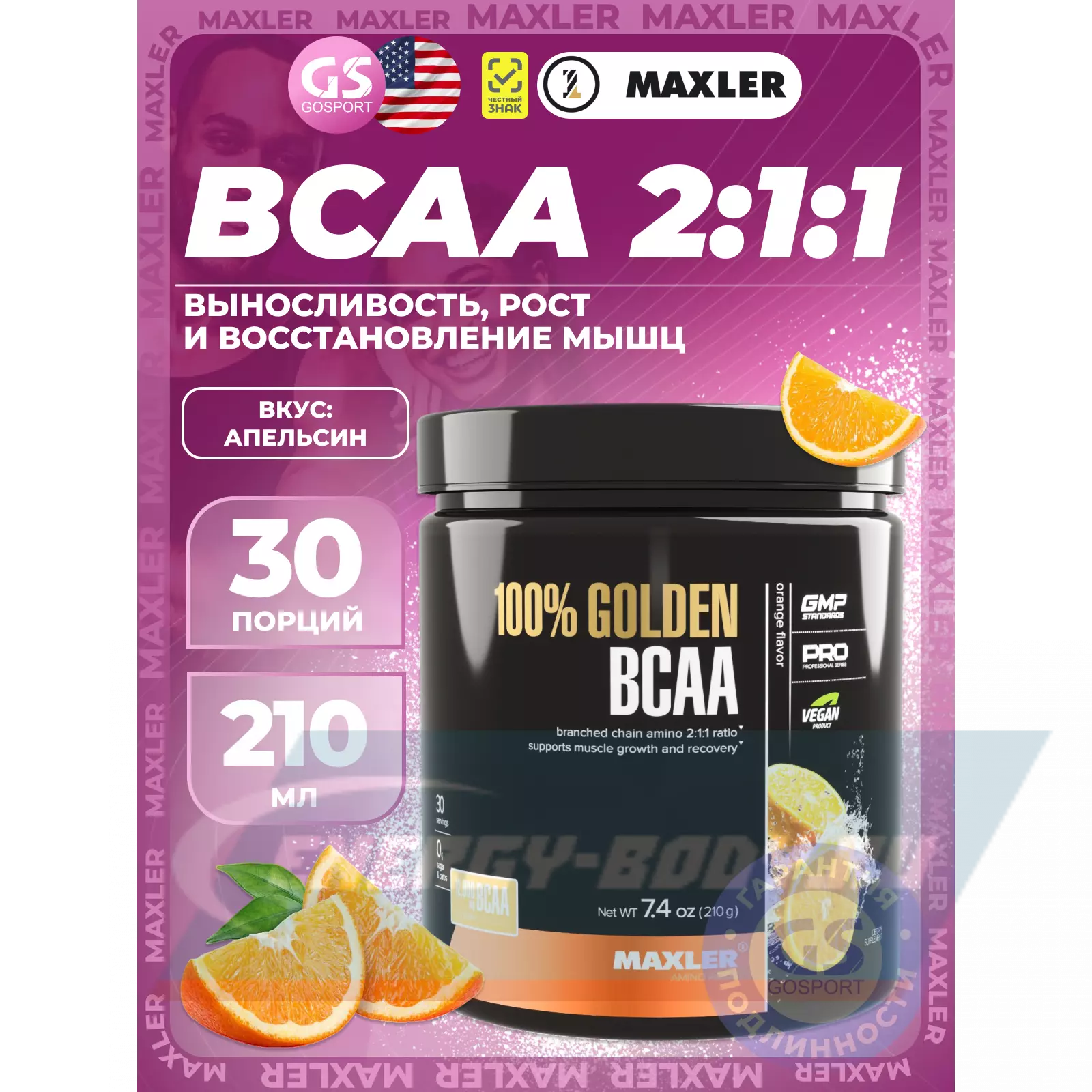 100% Golden BCAA – это мощная формула, содержащая аминокислоты с разветвленными цепями (BCAA) в классическом соотношении 2:1:1 (L-Лейцин, L-Изолейцин, L-Валин). BCAA – основной материал для построения мышц.