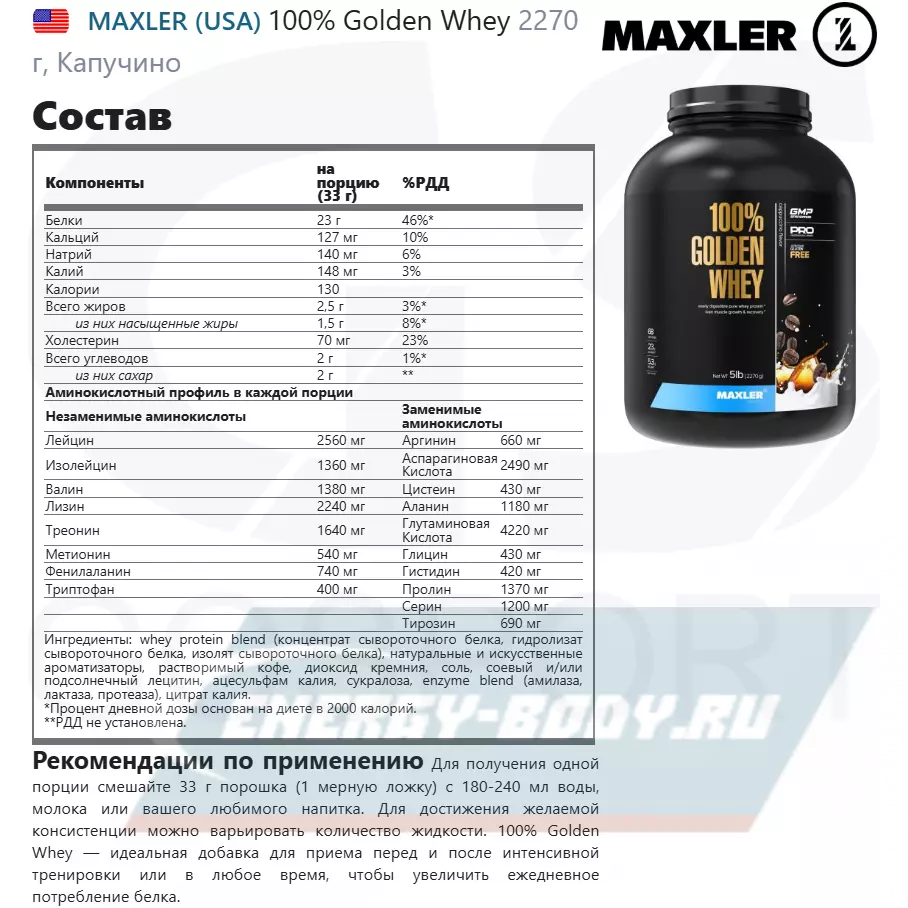 Рекомендации по применению Для получения одной порции смешайте 33 г порошка (1 мерную ложку) с 180-240 мл воды, молока или вашего любимого напитка. Для достижения желаемой консистенции можно варьировать количество жидкости. 100% Golden Whey — идеальная добавка для приема перед и после интенсивной тренировки или в любое время, чтобы увеличить ежедневное потребление белка.