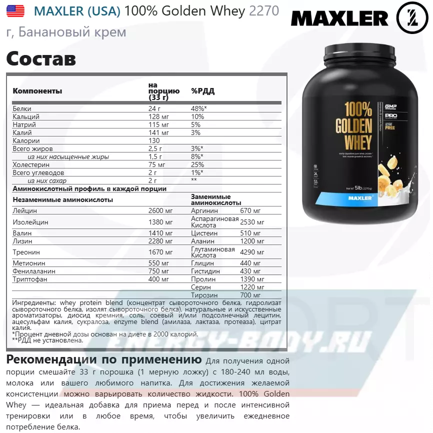100% Golden Whey – это чистый сывороточный белок премиум класса, который идеален в период повышенных физических нагрузок. Продукт содержит 100% чистый концентрат, изолят и гидролизат сывороточного протеина, которые быстро усваиваются. Незаменим в период интенсивных тренировок, когда необходимо увеличить потребление белка для поддержки положительного баланса азота и насыщения мышц необходимыми для роста аминокислотами. 100% Golden Whey обогащен незаменимыми аминокислотами с разветвленными боковыми цепями (BCAA) для быстрого восстановления мышечной ткани после тренировок.