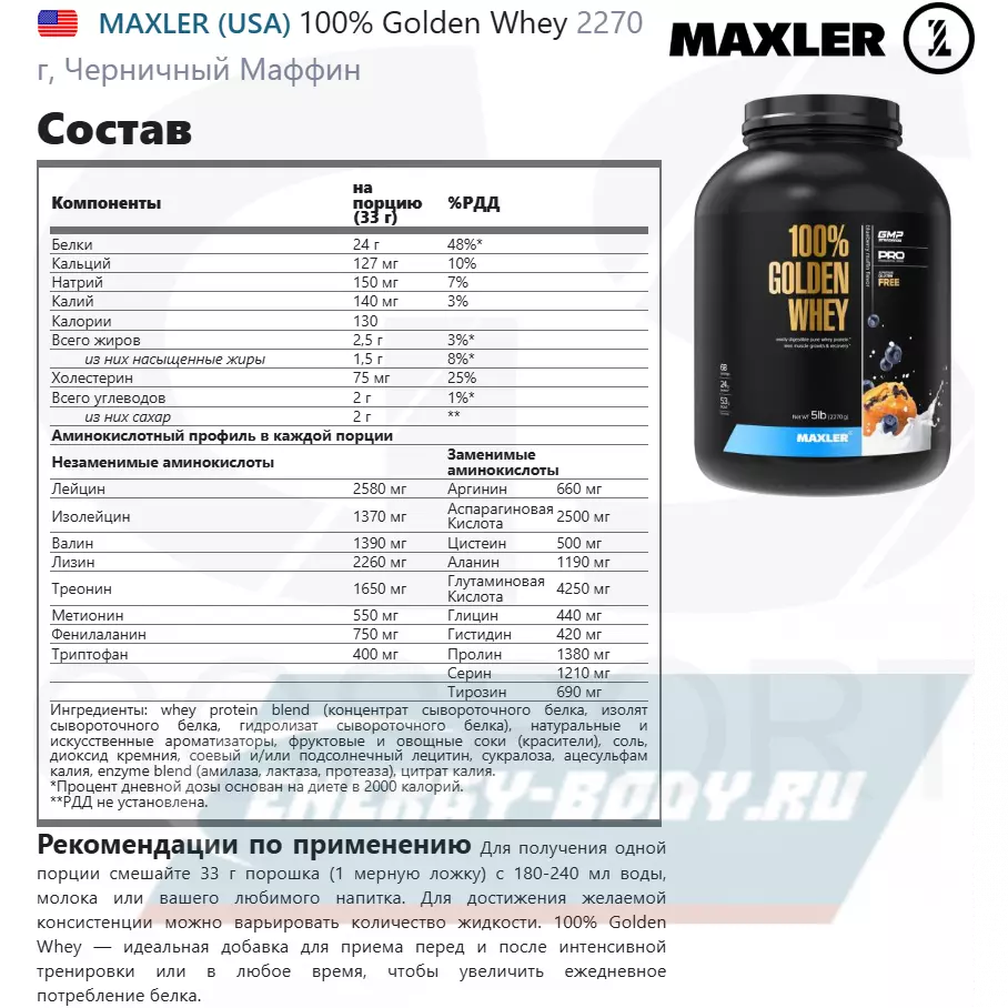 100% Golden Whey – это чистый сывороточный белок премиум класса, который идеален в период повышенных физических нагрузок. Продукт содержит 100% чистый концентрат, изолят и гидролизат сывороточного протеина, которые быстро усваиваются. Незаменим в период интенсивных тренировок, когда необходимо увеличить потребление белка для поддержки положительного баланса азота и насыщения мышц необходимыми для роста аминокислотами. 100% Golden Whey обогащен незаменимыми аминокислотами с разветвленными боковыми цепями (BCAA) для быстрого восстановления мышечной ткани после тренировок.