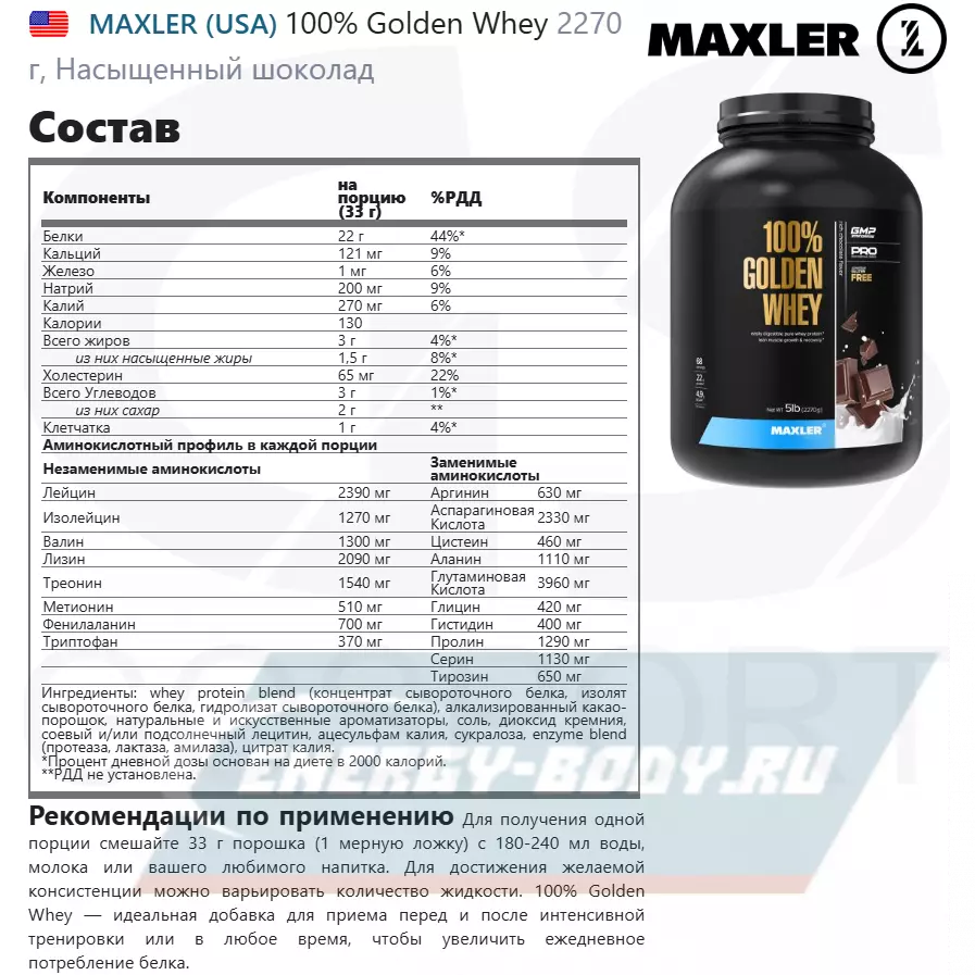 100% Golden Whey – это чистый сывороточный белок премиум класса, который идеален в период повышенных физических нагрузок. Продукт содержит 100% чистый концентрат, изолят и гидролизат сывороточного протеина, которые быстро усваиваются. Незаменим в период интенсивных тренировок, когда необходимо увеличить потребление белка для поддержки положительного баланса азота и насыщения мышц необходимыми для роста аминокислотами. 100% Golden Whey обогащен незаменимыми аминокислотами с разветвленными боковыми цепями (BCAA) для быстрого восстановления мышечной ткани после тренировок.