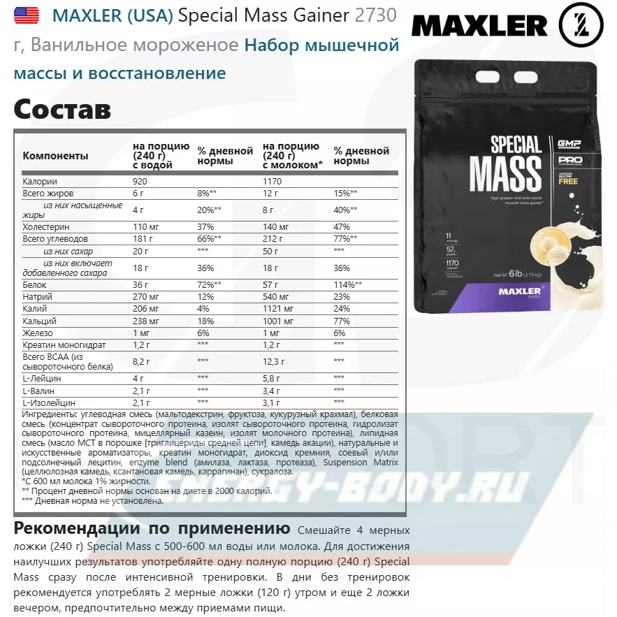 Рекомендации по применению Смешайте 4 мерных ложки (240 г) Special Mass с 500-600 мл воды или молока. Для достижения наилучших результатов употребляйте одну полную порцию (240 г) Special Mass сразу после интенсивной тренировки. В дни без тренировок рекомендуется употреблять 2 мерные ложки (120 г) утром и еще 2 ложки вечером, предпочтительно между приемами пищи.