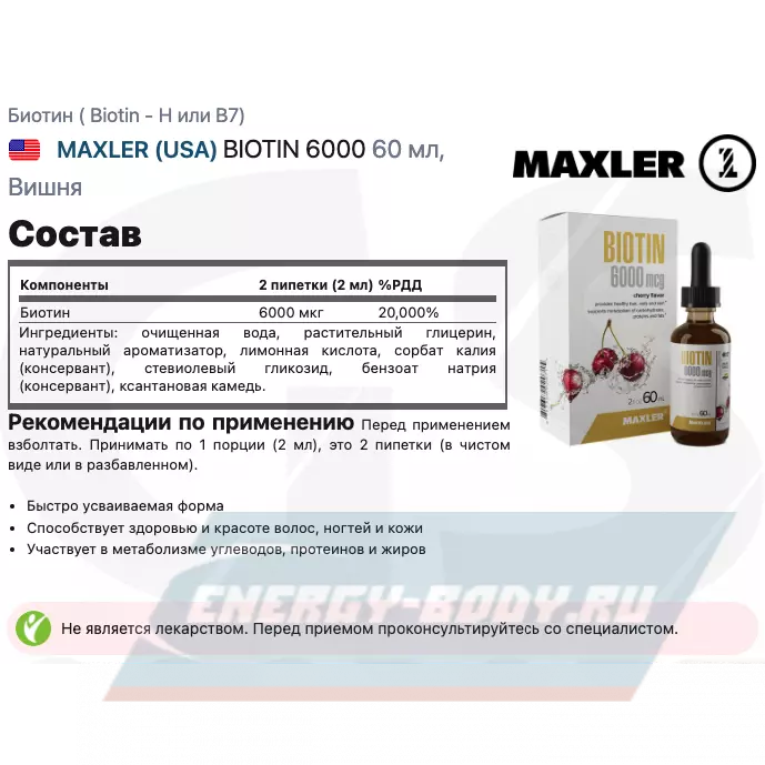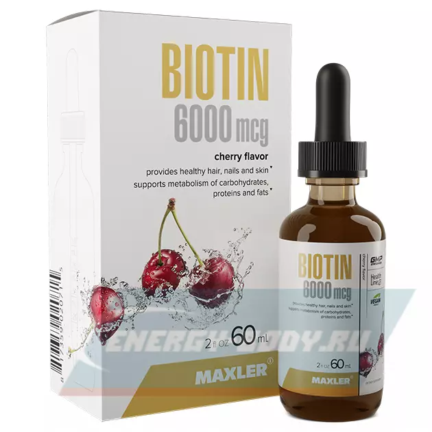 С каждой порцией Biotin 6000 mcg от Maxler вы обеспечите себя биотином, причем в быстро усваиваемой жидкой форме. Какую роль выполняет данный витамин в нашем теле? Он играет одну из ключевых ролей в сохранении здорового и красивого внешнего вида кожи, волос и ногтей. При его участии наш организм перерабатывает углеводы, жиры и белки, которые попадают в него, на энергию.