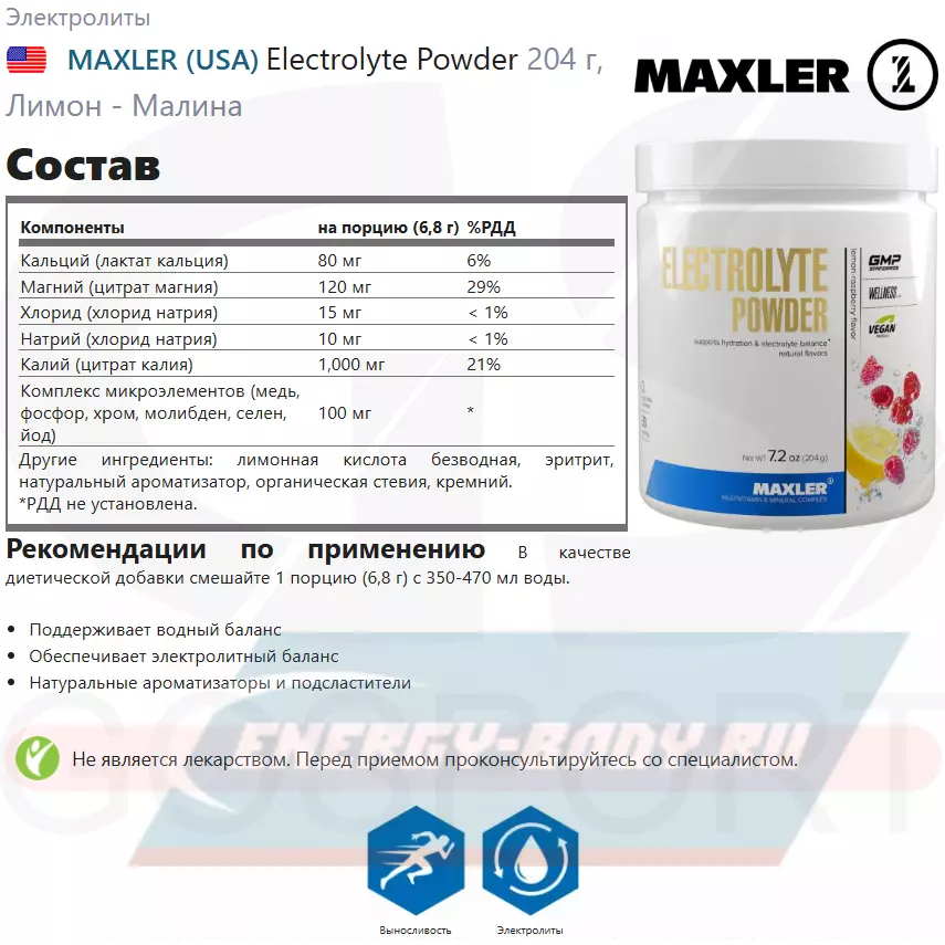 В состав Electrolyte Powder входит 5 электролитов, а также важные микроэлементы для поддержания здорового водного баланса. Продукт помогает восполнить потраченные во время длительных тренировок запасы электролитов, воды и энергии. Идеальный баланс кальция, магния, хлорида, натрия и калия способствует хорошему самочувствию и позволяет быть энергичным в течение всего дня. Комплекс поддерживает ваш активный образ жизни и повышает работоспособность.