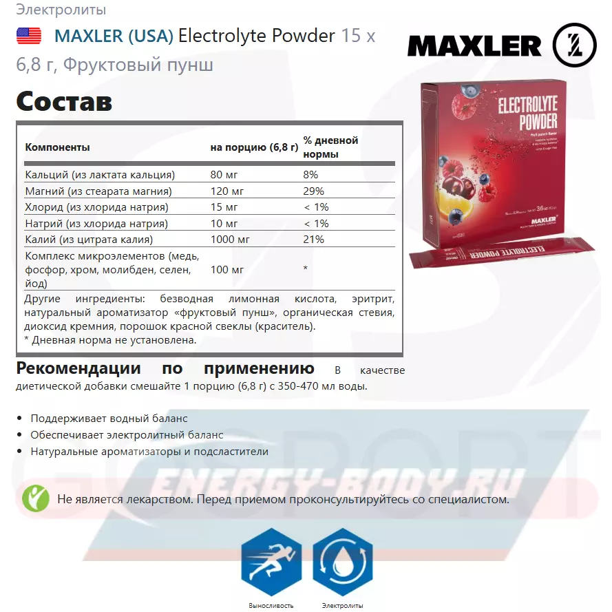 В состав Electrolyte Powder входит 5 электролитов, а также важные микроэлементы для поддержания здорового водного баланса. Продукт помогает восполнить потраченные во время длительных тренировок запасы электролитов, воды и энергии. Идеальный баланс кальция, магния, хлорида, натрия и калия способствует хорошему самочувствию и позволяет быть энергичным в течение всего дня. Комплекс поддерживает ваш активный образ жизни и повышает работоспособность.
