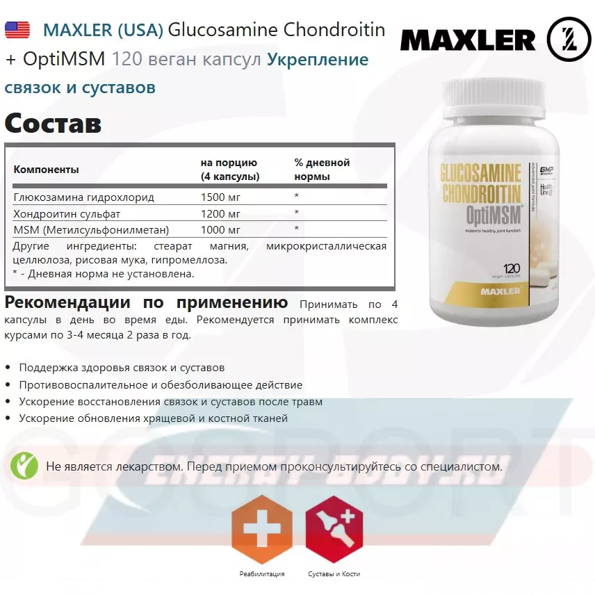 Состав MAXLER Glucosamine Chondroitin + OptiMSM