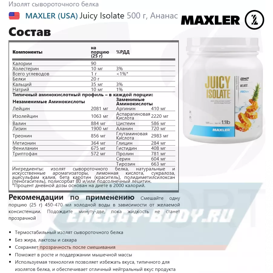 Juicy Isolate – это изолят белка с высокой питательной ценностью и чистым вкусом. Это прекрасный источник незаменимых аминокислот, в том числе ВССА - аминокислот с разветвлённой цепью. Juicy Isolate от Maxler – это лёгкий высокобелковый освежающий напиток, который поможет в росте и поддержании мышечной массы.