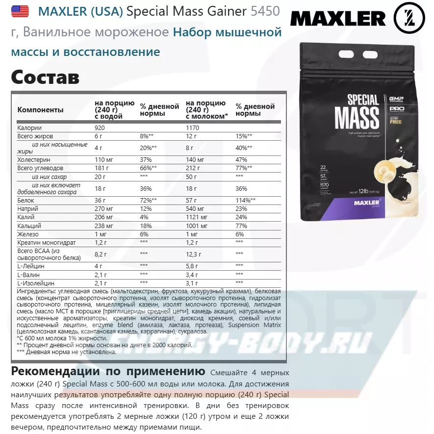 для получения одной порции смешайте 240 г порошка (4 мерные ложки) с 550-600 мл воды или молока. Для достижения желаемой консистенции можно варьировать количество жидкости. Употребляйте одну порцию Special Mass сразу после тренировки. В свободные от тренировок дни рекомендуется употреблять 0,5 порции (2 мерные ложки) продукта утром и 0,5 порции (2 мерные ложки) вечером между основными приемам пищи.