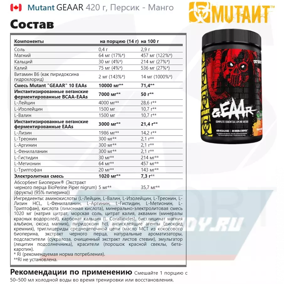 В состав Mutant Geaar входят 9 г незаменимых аминокислот (EAA) плюс аргинин, из которых 7 г BCAA в соотношении 4:1:1. В формуле комплекса используются только 100% веганские ферментированные аминокислоты свободной формы для оптимизации растворимости.
