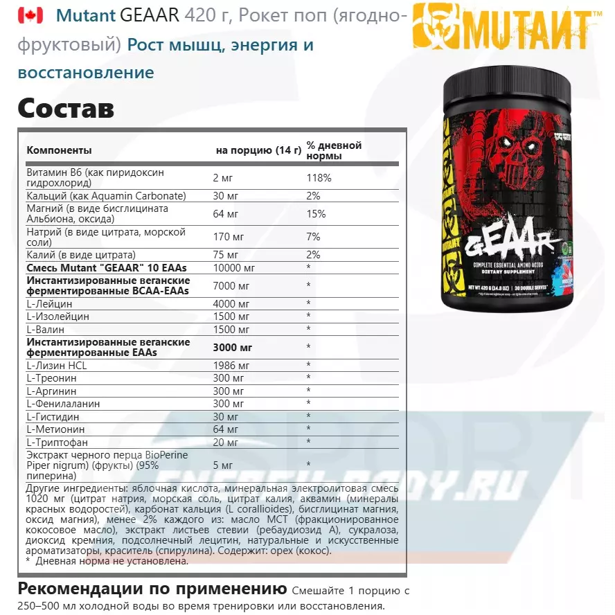 В состав Mutant Geaar входят 9 г незаменимых аминокислот (EAA) плюс аргинин, из которых 7 г BCAA в соотношении 4:1:1. В формуле комплекса используются только 100% веганские ферментированные аминокислоты свободной формы для оптимизации растворимости.