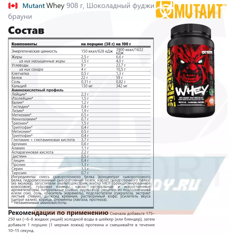 Для тяжелоатлетов и бодибилдеров рекомендуется увеличить дозировку до 3 мерных совка порошка MUTANT WHEY на один коктейль, предварительно смешав с 500 мл воды.