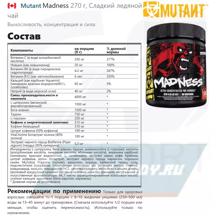 Предтренировочный комплекс Madness от Mutant предназначен для усиления физического потенциала организма перед тренировочной сессией. Обеспечивается подобный эффект специальными смесями на основе креатина, аргинина, цитруллина, бета-аланина и кофеина. Чтобы каждый из компонентов усваивался эффективнее, в состав включен BioPerine.