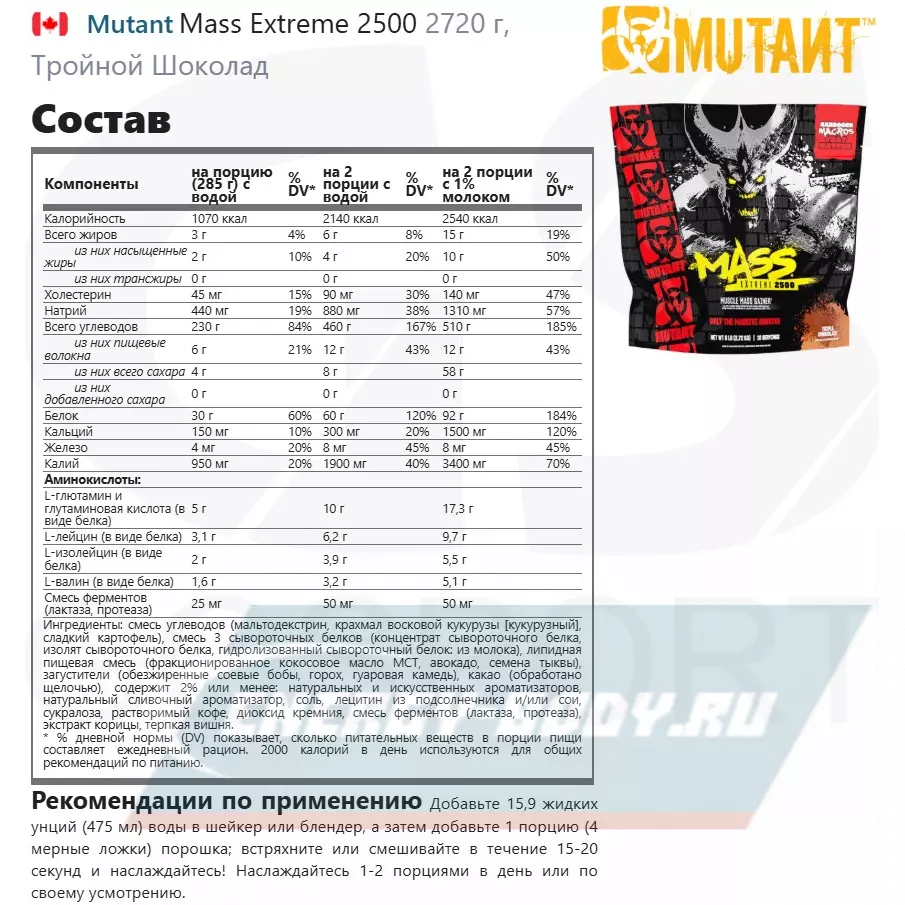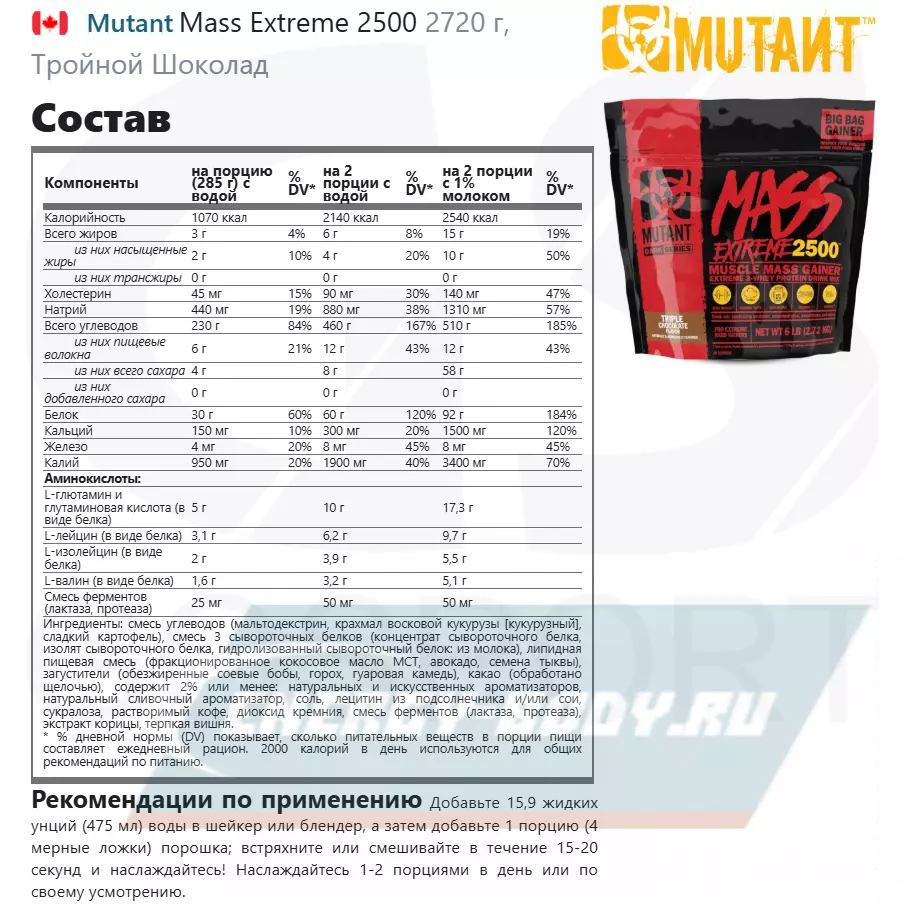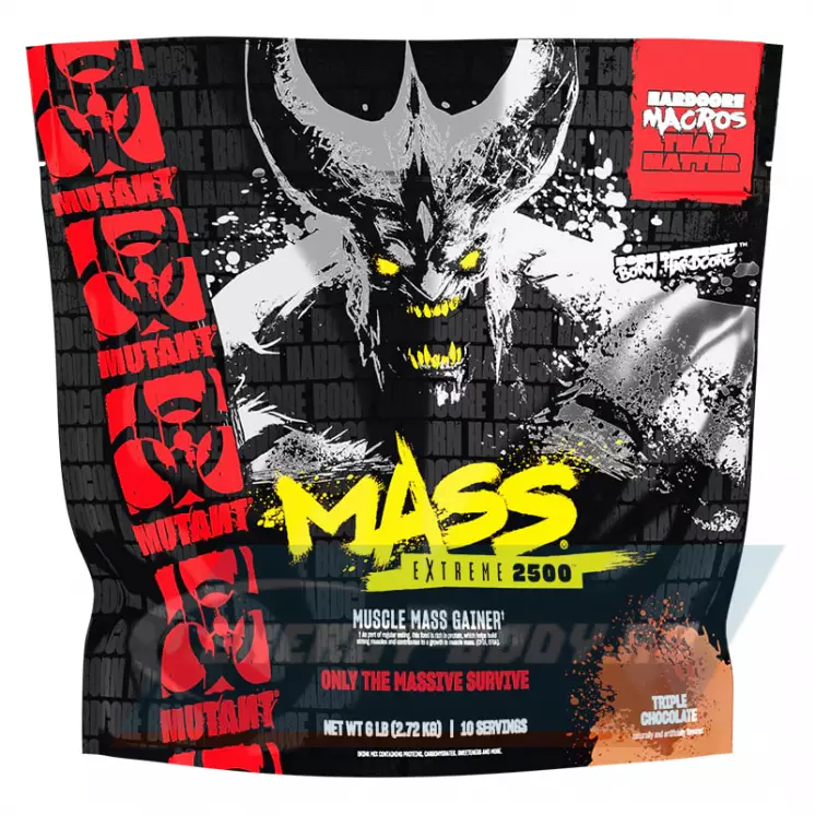 Белково-углеводный комплекс Mass XXXTREME 2500 от Mutant относится к высококалорийный гейнерам с пропорциональным соотношением белов к углеводам равным 1 к 8, что обеспечивает тот необходимый набор питательных веществ для поддержания массонабора в ситуациях, когда это дается действительно тяжело.