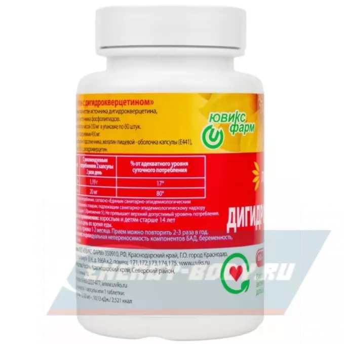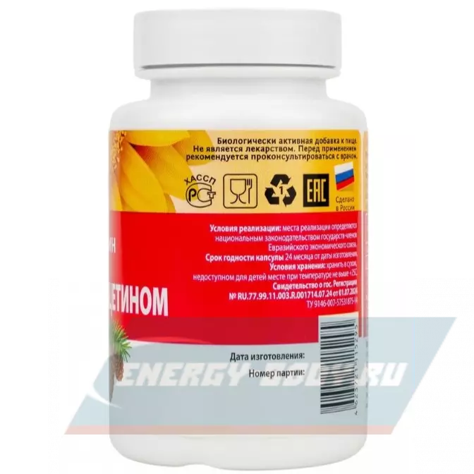 Ингредиенты: лецитин подсолнечника, желатин пищевой - оболочка капсулы (Е441), аэросил - носитель (Е551), дигидрокверцетин.