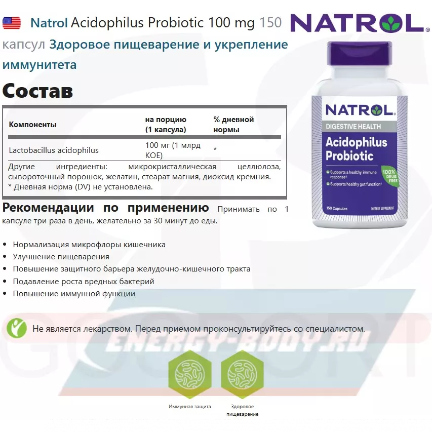 Natrol Acidophilus Probiotic 100 mg 150 капсул — Здоровое пищеварение и укрепление иммунитета