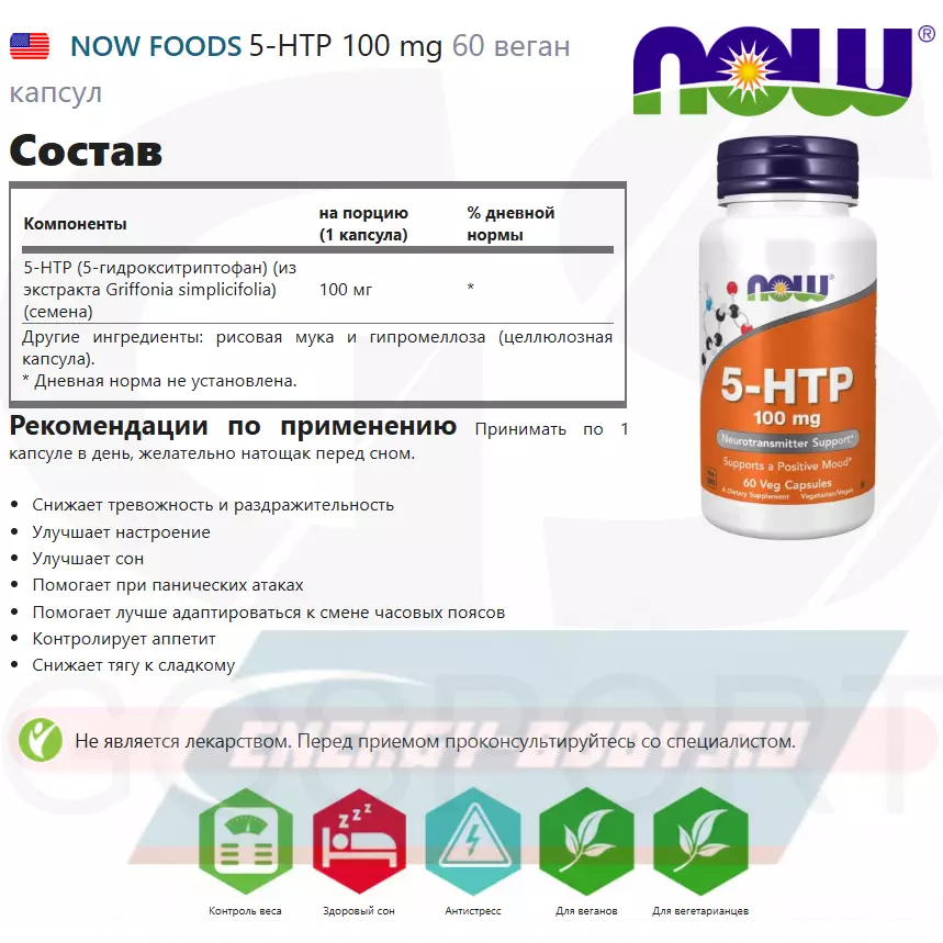 NOW 5-HTP 100mg (5-гидрокситриптофан) – промежуточный метаболит между аминокислотой L-триптофан и серотонином, получаемый из семян африканского растения Griffonia simplicifolia.