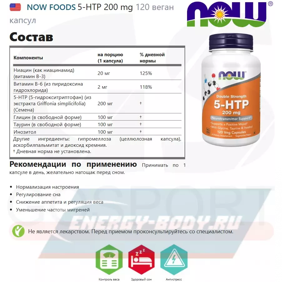 Показания к применению NOW® 5-HTP 200 mg: