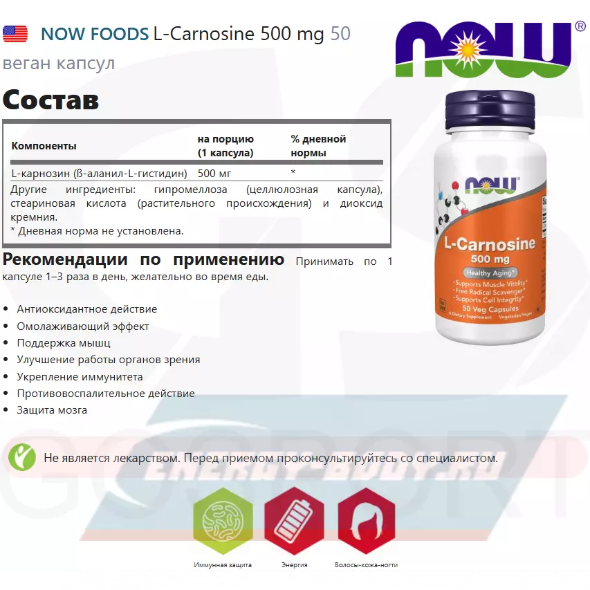 L-Carnosine от NOW восполняет этот недостаток, оказывая антиоксидантное и заметное омолаживающее действие, улучшает мозговую активность и предотвращает депрессию.