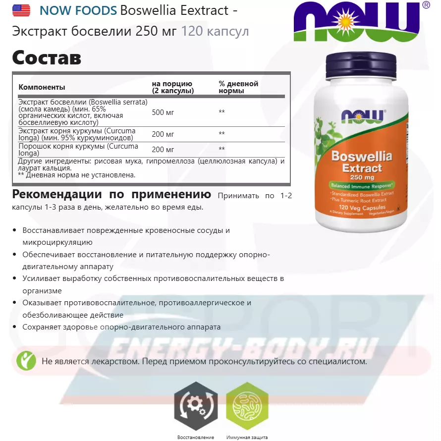 БАД «Экстракт Босвелии» (Now Foods) ─ эффективное натуральное средство, используемое для локализации воспаления. Основная задача препарата ─ подавление выработки медиаторов, то есть веществ, провоцирующих развитие патологических процессов в организме. В его основе ─ вытяжка полезных компонентов из смолы одноимённого растения. Препарат отличается высокой биодоступностью и абсолютной безопасностью. Эффективность биологически активной добавки подтверждена сертификатом GMP.