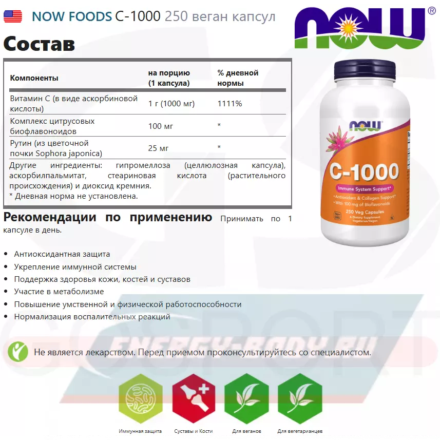 С-1000, Витамин С- 1000 мг, Комплекс Биофлавоноидов (250 капсул) - средство, выступающее в качестве источника витамина С.