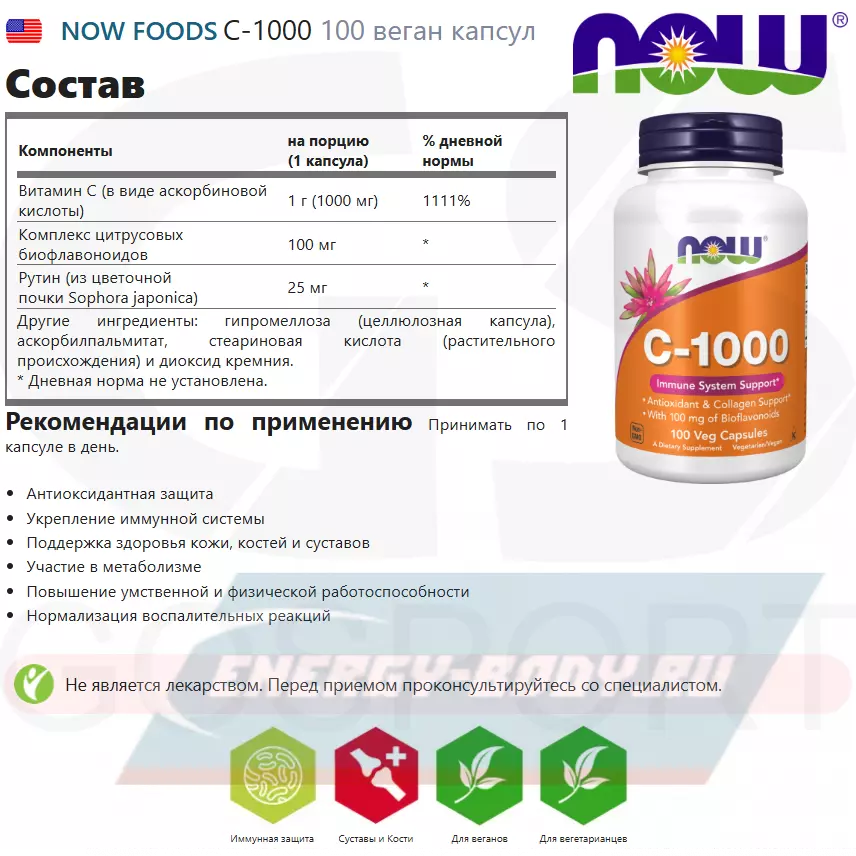 С-1000, Витамин С- 1000 мг, Комплекс Биофлавоноидов (250 капсул) - средство, выступающее в качестве источника витамина С.
