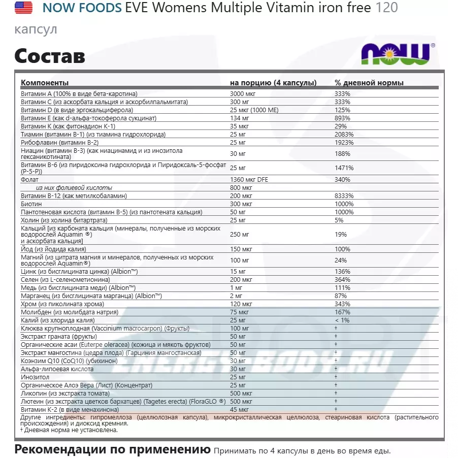 Состав NOW FOODS EVE Womens Multiple Vitamin iron free