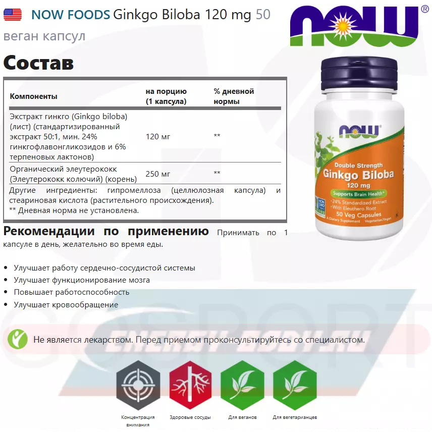 Состав NOW Foods Ginkgo Biloba 120 mg