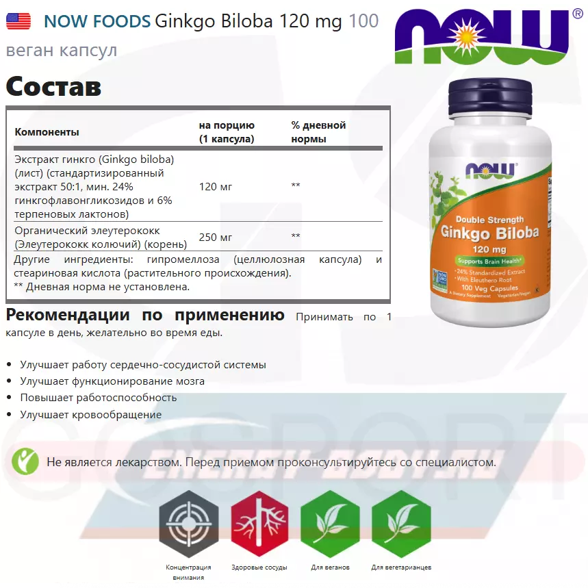 Состав NOW FOODS Ginkgo Biloba 120 mg