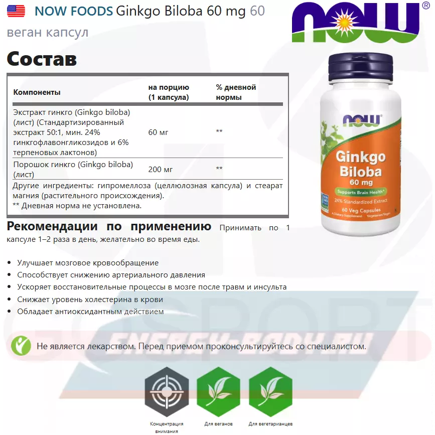 NOW Ginkgo Biloba – Гинкго Билоба рекомендуется принимать в качестве биологически активной добавки к пище по 1 капсуле 1–2 раза в день, желательно во время еды.
