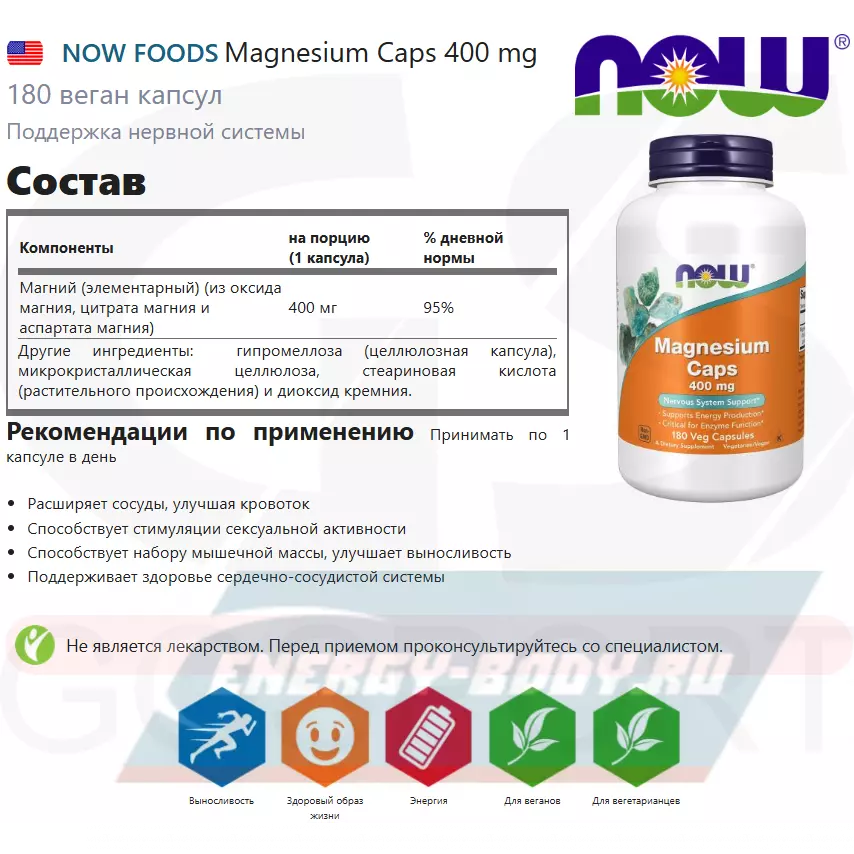 Магний (элементарный) (из оксида магния, цитрата магния и аспартата магния) | 400 мг | 95% |