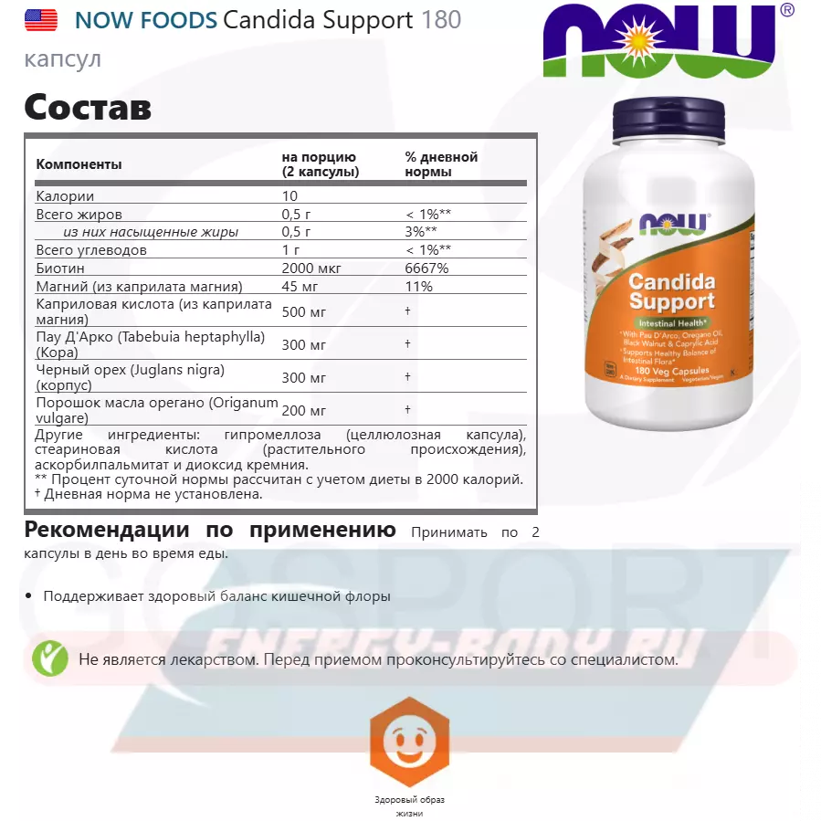 Candida albicans — это встречающиеся в природе дрожжи, которые обычно находятся в кишечнике как часть нормальной кишечной флоры. Candida Support — это комбинация традиционных растительных ингредиентов (пау д'арко, черного ореха и масла орегано), биотина (витамина группы B) и каприловой кислоты (натуральная жирная кислота, получаемая из растительных масел), которые могут помочь поддержать здоровый баланс кишечных бактерий. Хотя Candida Support не предназначен для удаления Candida albicans из кишечника, он может помочь поддержать здоровый баланс кишечной флоры.