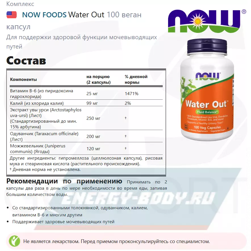 Биодобавка «Вотер Аут» от всемирно известной американской компании «Нау Фудс» пользуется большим спросом, так как доказала свою эффективность. Состав БАД Water Out тщательно продуман, в нём каждый компонент играет свою роль: