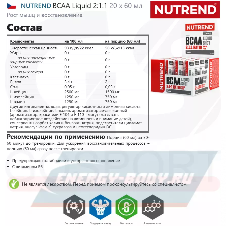В состав продукта входит специально рассчитанная матрица из аминокислот лейцин, валин и изолейцин, которая дополнена витамином В6. Разветвлённые аминокислоты используются в качестве одного из базовых строительных компонентов при синтезе мышечного белка, а также способствуют ускорению данного процесса естественным путём, что повышает анаболический уровень. Витамин В6 принимает участие в ряде обменных процессов, оптимизируя их результативность, что также позволяет повысить количество усваиваемых из продуктов питания и специальных препаратов полезных веществ. Отзывы о Nutrend BCAA Liquid вы можете самостоятельно найти и почитать на соответствующих по тематике сетевых форумах и сайтах, что позволит составить более всестороннее представление о продукте на основе персональных впечатлений других покупателей.