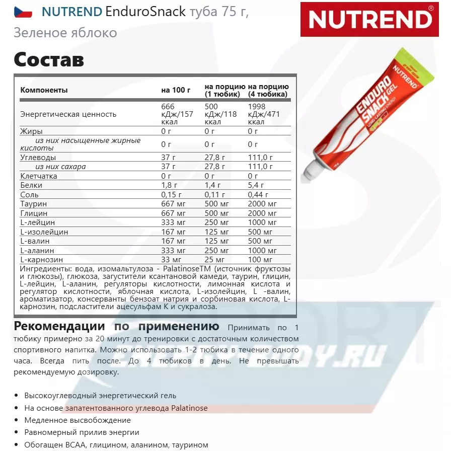 Зелёное яблоко: вода, изомальтулоза – Palatinose™ (источник фруктозы и глюкозы), глюкоза, загуститель ксантановая камедь, таурин, глицин, яблочная эмульсия, L-лейцин, L-аланин, регуляторы кислотности лимонная и яблочная кислота, L-изолейцин, L-валин, консерванты бензоат натрия и аскорбиновая кислота, L-карнозин, подсластители ацесульфам K и сукралоза.
