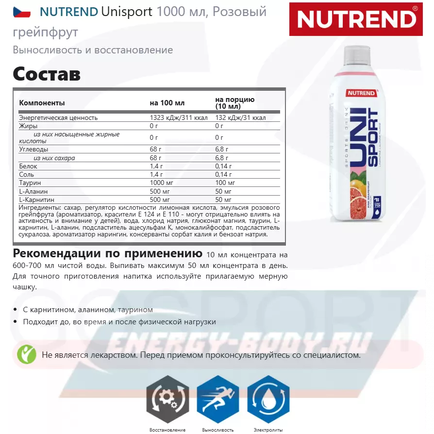 NUTREND Unisport 1000 мл, Розовый грейпфрут — Повышение выносливости и ускорение восстановления